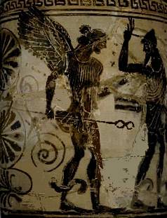 The winged, snake-waving Tuchulcha is also easily recognizable in this scene on an Etruscan vase from a tomb in Vulci. Here he is paired with the guardian demon of Hades, Charun (= the Greek Charon, ferryman of the dead), who wields a large wooden hammer or key to unlock the gates of the Underworld and imprison Alcestis, the heroine of the Greek tragedy of that name who offered to take his place in Hades so that he does not have to die right away. Here the couple bid each other a fond farewell. A typical "departure" scene on Etruscan tomb art. Note the wings on the sandals of both demons, adopted by the Etruscans from the winged sandals of the god Hermes, who conducted the souls of the dead into Hades. [4]-- Tuchulcha, the Etruscan Bird-Man from Hades, Dionysia Xanthippos.