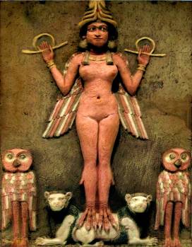Os instrumentos de escrita que expões em ambas as mãos são seguramente as tábuas do destino que Inana roubou a Enki, os dois leões são os animais totémicos da Deusa Mãe que na Grécia seria Deméter, mãe de Koré. Como esta foi também Atena, a deusa dos mochos, estamos perante Anat, uma variante negra de Ashera.