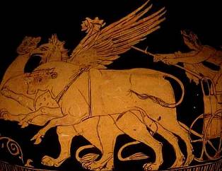 Figura 43: Grifo atrelado ao carro do sol. A representação deste vaso grego refere-se a um óbvio mito arcaico do «grifo» como animal de transporte do pequeno sol nascente condenado a ser devorado pela própria mãe, a aurora que o deu à luz.