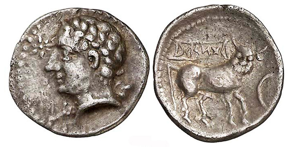 Figura 2: Obverse Description: Hercules head left, club on right shoulder, star before. Reverse Legend: ARS-Ki-TaR, Man-headed bull standing right, bearded head facing, crescent before.